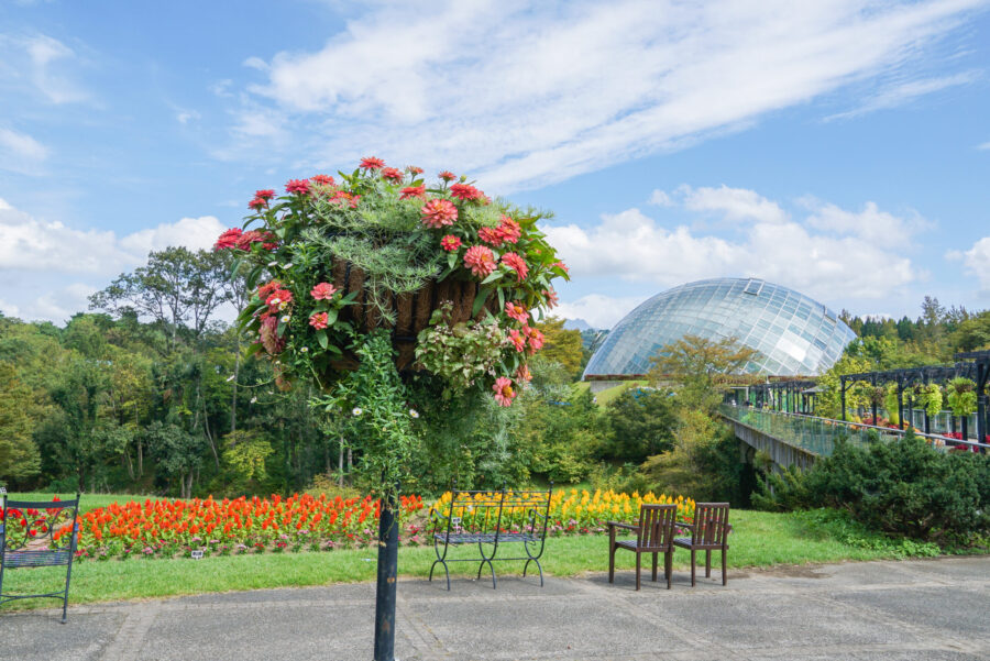 鳥取の秀峰大山の麓に広がる西日本最大級のフラワーパーク。 センターに位置するドーム型ガラス温室を中心に、五大陸展示花壇やヨーロッパ風花壇、アイリス池など、美しい花々が四季を彩ります。 屋根付き展望回廊が園内をぐるりと一周し、天候・季節に関わらず年中いつでも楽しめます。