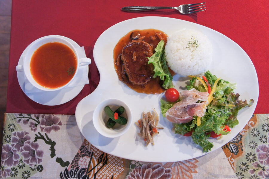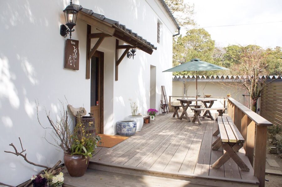 築100年以上の旧家の蔵を、趣のあるカフェ兼着物リメイクショップにリノベーション。 大きなクスの木の木漏れ日と小鳥のさえずりが気持ちのいいテラス席もあります。