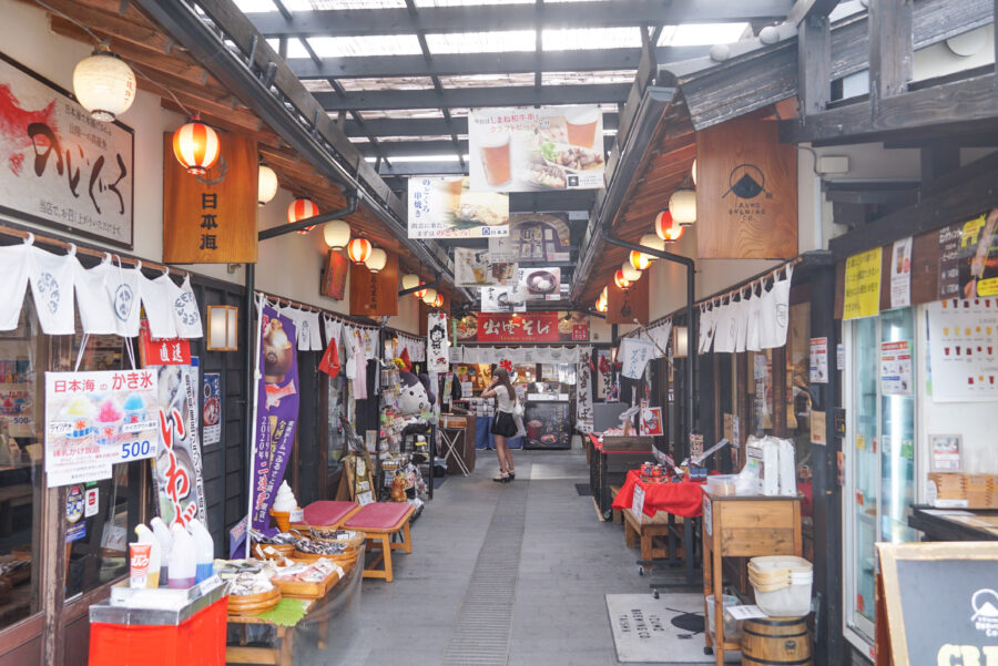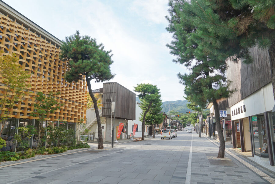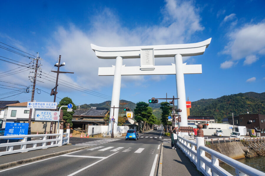 出雲大社の入り口となる一の鳥居から正門まで約700m、出雲大社の表参道がまっすぐ伸びています。 松並木の参道の両側には、お土産屋さんや出雲そば、ぜんざい、パワーストーンの店、カフェ、ご縁横丁など、様々なお店が並ぶ賑やかな通りです。