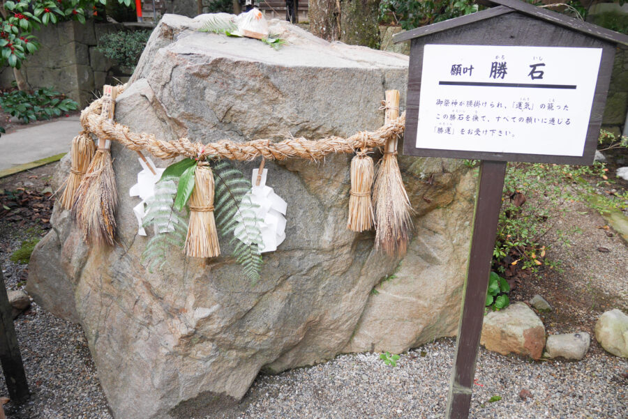 物部神社境内には、ウマシマジノミコトが降臨の際に腰掛けたとされる「勝石」が、また本殿真裏の八百山中腹にはウマシマジノミコトの墓所があります。