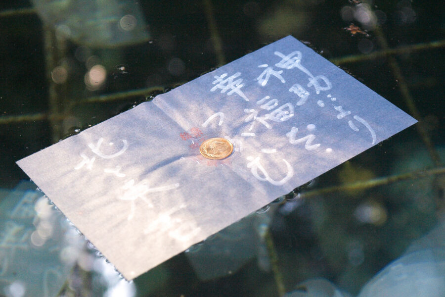 境内奥地にある佐久佐女(さくさめ)の森で、和紙に硬貨を乗せ「鏡の池」に浮かべて、ご縁を占う「縁占い」が大人気。