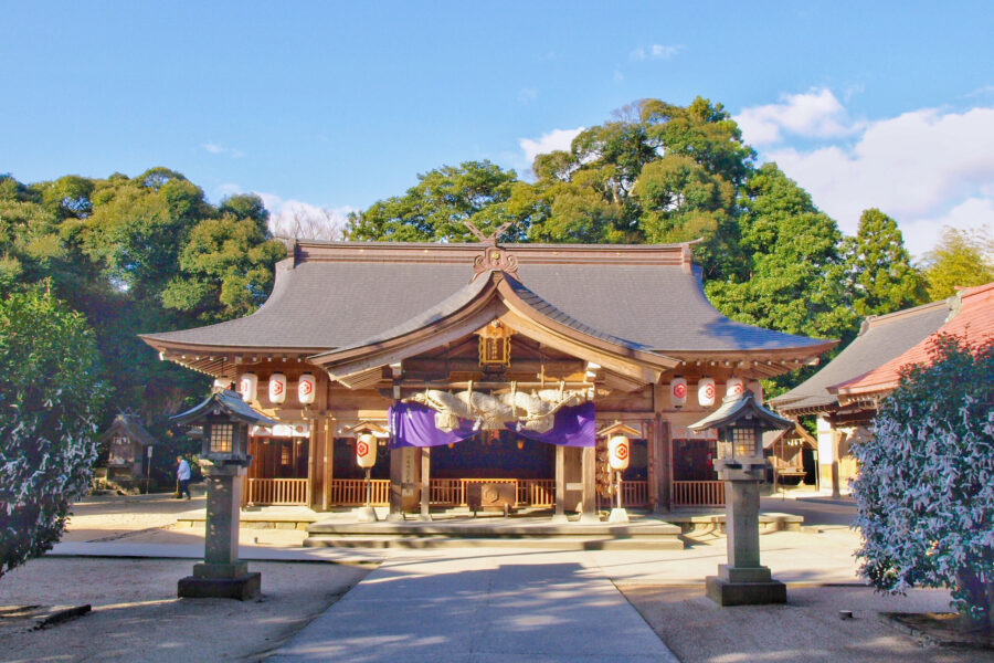 ウマシマジノミコトが鶴に乗って降臨し、勝運を運んでこられた故事にちなみ、真っ赤な太陽を背負った鶴が神紋です。