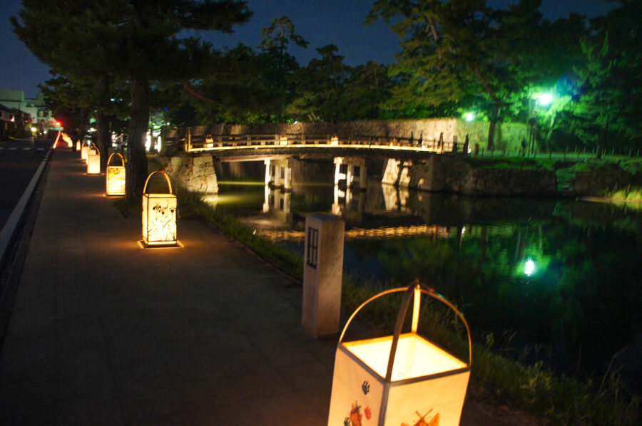 「松江水燈路(まつえすいとうろ)」は、松江城周辺をライトアップする光のイベントで、城下町松江ならではの光と影が織りなす幻想的な風景を楽しむことができます。